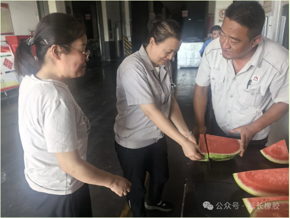 近日,陕西地区持续高温,户外温度直逼 40℃。在这样的闷热天气中,延长橡胶公司的生产一线依旧呈现出一片繁忙的景象。原材料库的工作人员们始终坚守在库区的各个岗位上,全力保障全钢、半钢轮胎的生产供应,采供部更是针对性地开展了一系列 “送清凉” 活动,为一线人员注入夏日里的清凉动力。